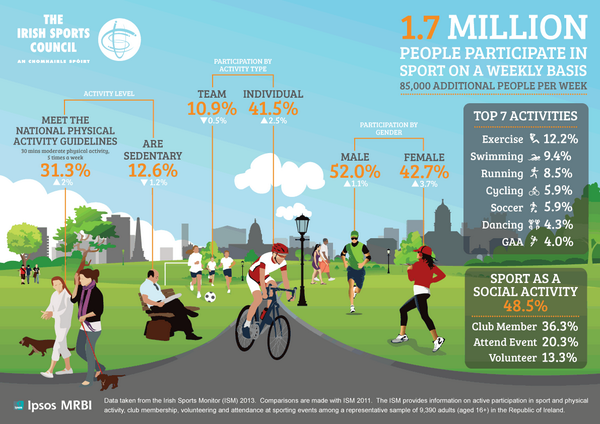 Day 2: Today involved much of the same stuff as yesterday, although today Garvan allowed me to update the Wicklow LSP socail network sites. I was also looking at invoices from a few different sport companies regarding Sports Equipment. I had to calculate the price per unit after VAT and then display the info on a table in Exel. I looked at all the different companies and told Garvan which was working out the cheapest. Garvan then showed me some very interesting infographs on the participation of Irish people in sport, like the one shown below.